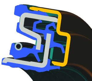 sezione di CASSETTE S4 Tutte le parti funzionali della tenuta (labbro di tenuta, superficie di lavoro ottimizzata del labbro, labbro di esclusione dello sporco, contro-superfici dedicate e lubrificazione interna) sono protette all’interno del design chiuso: viene ridotto il numero di componenti da gestire e il rischio di danni accidentali durante la manipolazione e il montaggio.